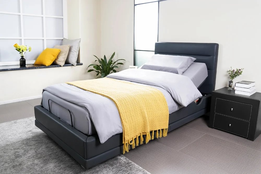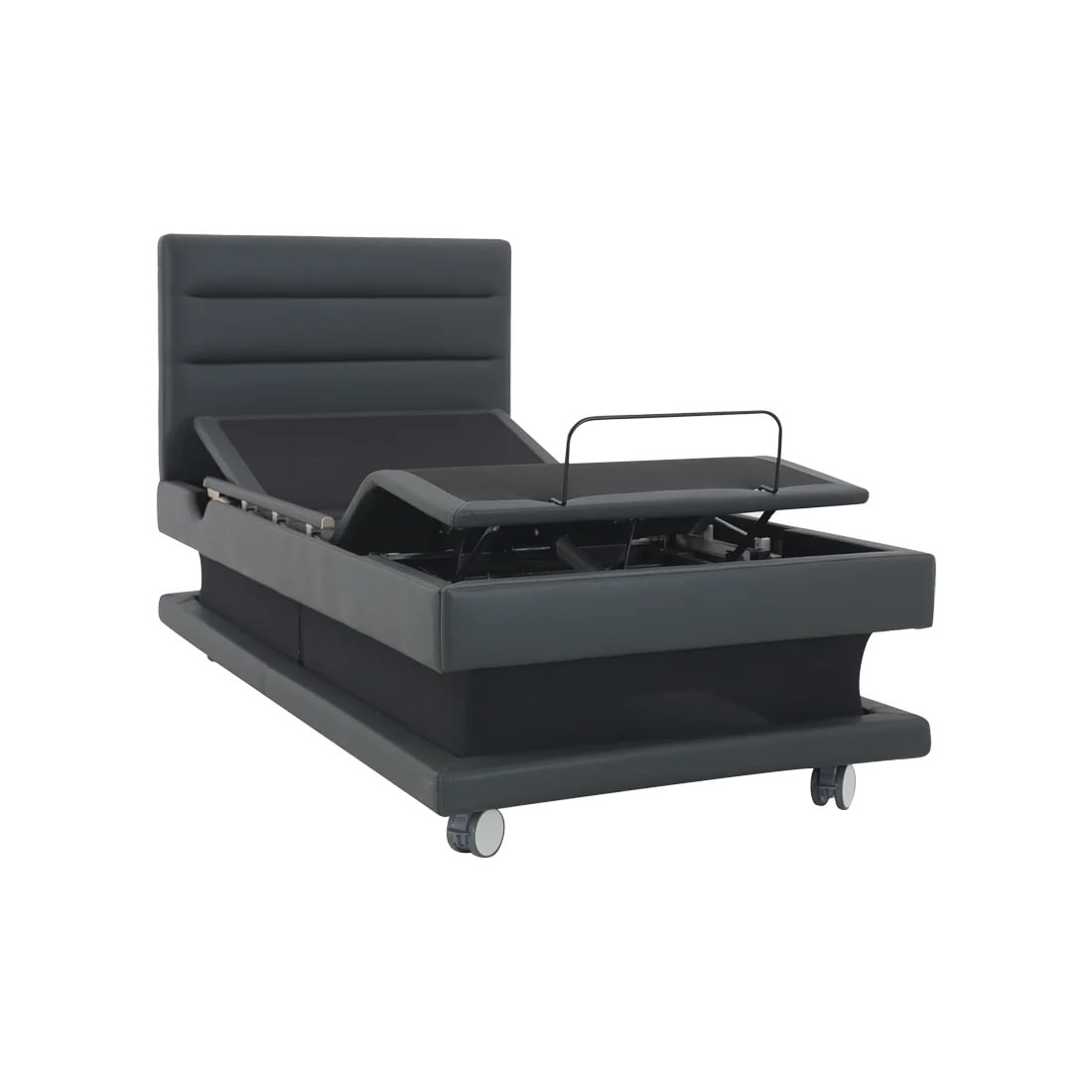 Rafstýrð hæðarstilling: Rúmbotninn er rafknúinn og hægt er að hækka eða lækka allan grunninn frá gólfi. Þetta tryggir að hæð rúmsins sé stillanleg fyrir betra aðgengi og notkun við ýmsar aðstæður.